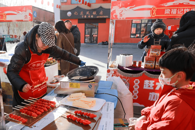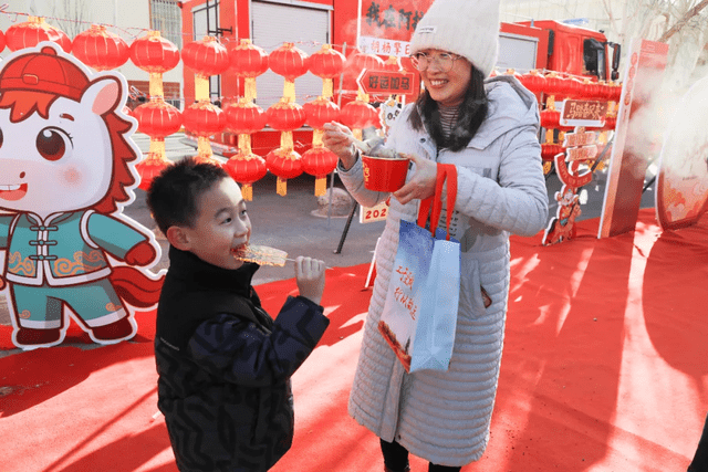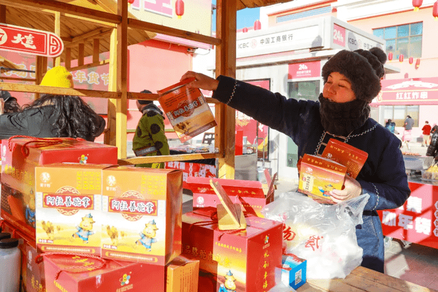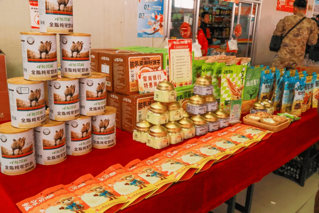 活动现场张灯结彩,喜庆氛围浓厚,近40个特色摊位整齐排布,涵盖内蒙古醇香奶食品、新鲜牛羊肉、阿拉善驼肉干、驼绒制品、手工艺品及新春糕点等各类好物,琳琅满目、种类丰富,满足居民一站式囤货需求。