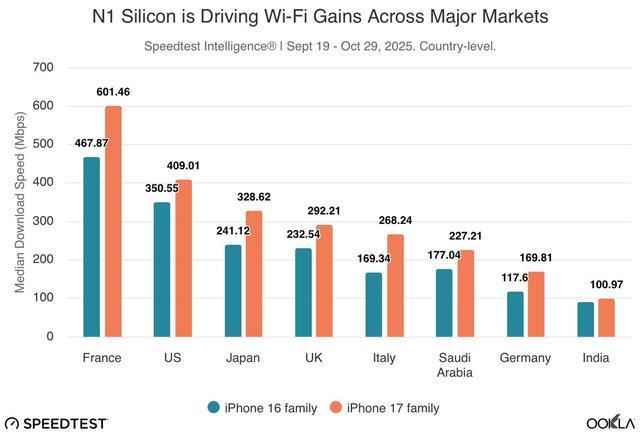 苹果iPhone 17在北美的中位及90分位都显著领先,这表明苹果无线系统架构更注重典型环境下的整体表现,而非实验室里标称速度。家庭环境中的网络干扰、接入点布局与频谱状况往往更具挑战性——N1芯片的优势在此得到体现。